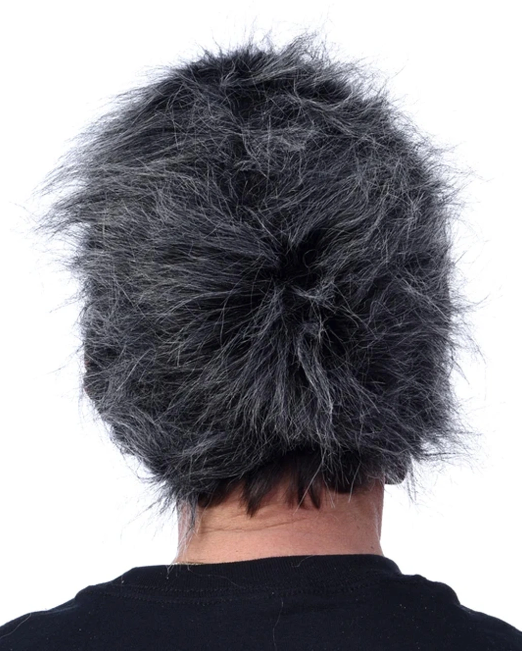 Gruselige Zombiemaske eines Untoten mit einem heraushängenden Auge und tiefen Kerben in der Schädeldecke.