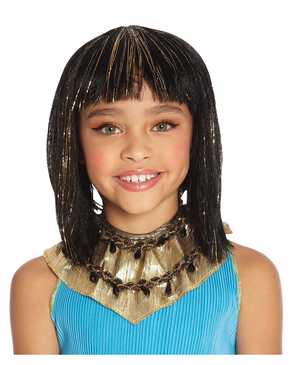 Die Kinderperücke Kleopatra weist eine Haarlänge von ca. 28cm auf. Neben dem klassischen, geraden Schnitt mit Pony sorgen goldene Strähnchen dafür, dass dich die Kleopatra-Frisur im Handumdrehen in eine ägyptische Gott-Königin verwandelt. Ein innen eingearbeitetes Netz verhindert störendes Jucken und erhöht so den Tragekomfort der Faschings-Perücke für Kinder. Dazu passen das Kleopatra Schmink Set mit Wimpern und das Cleopatra Schmuckset.