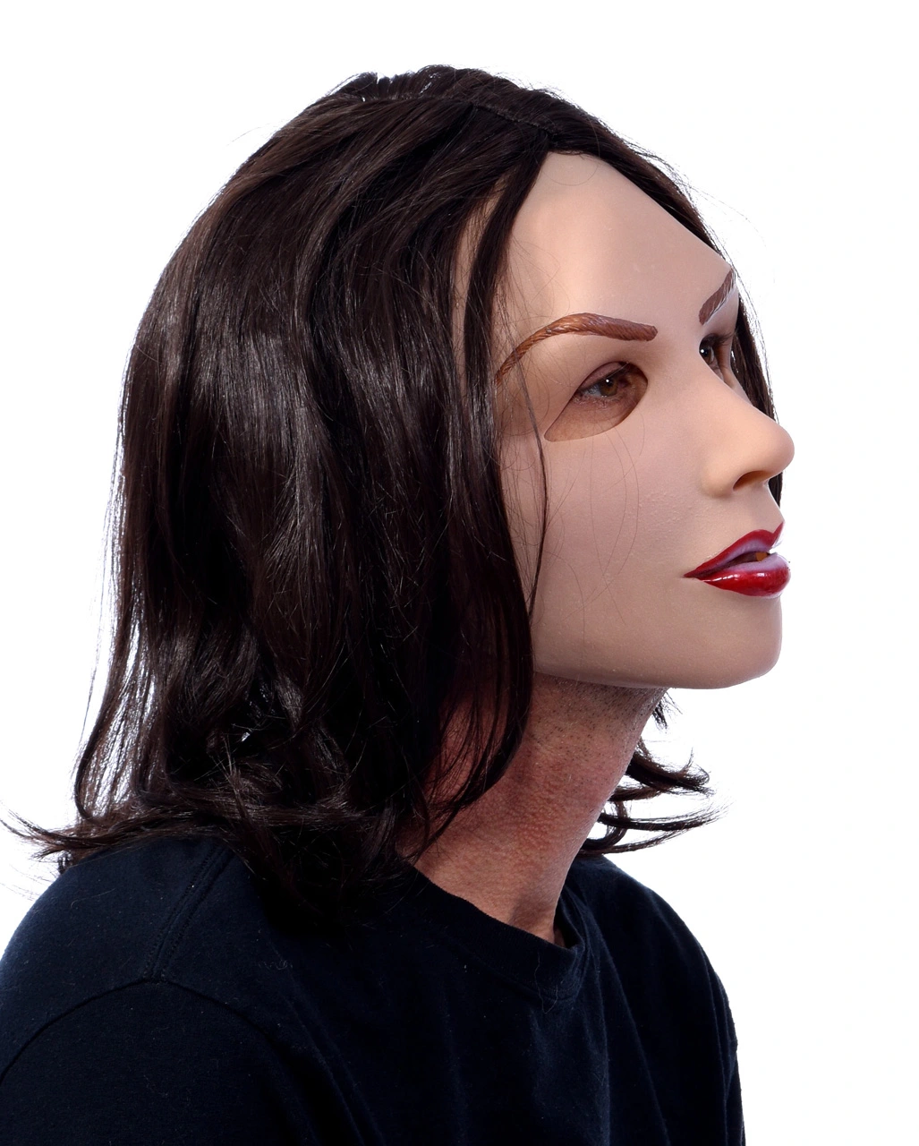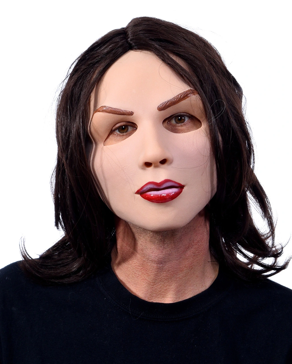 Die sexy Frauenmaske mit Schmollmund ist aus weichem Soft- Latex gefertigt und passt sich ideal der Gesichtsform des Trägers an. Augen, Mund und Nase sind ausgeschnitten, so dass es freies Sichtfeld und genügend Luft zum Atmen gibt. Für die Vollendung der perfekten Schönheit sorgt die dunkelbraune Perücke, deren Haare bis zu den Schultern reichen.